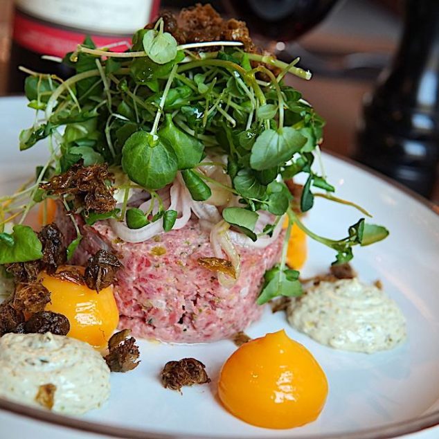 Den smakrika och krämiga biffen serveras med len, bakad äggula och kaprismajonnäs. Genom att toppa med friterad kapris får vi en härligt krispig känsla. Ärtskott, frisésallad eller något annat grönt balanserar upp med en frisk och tuggig känsla.