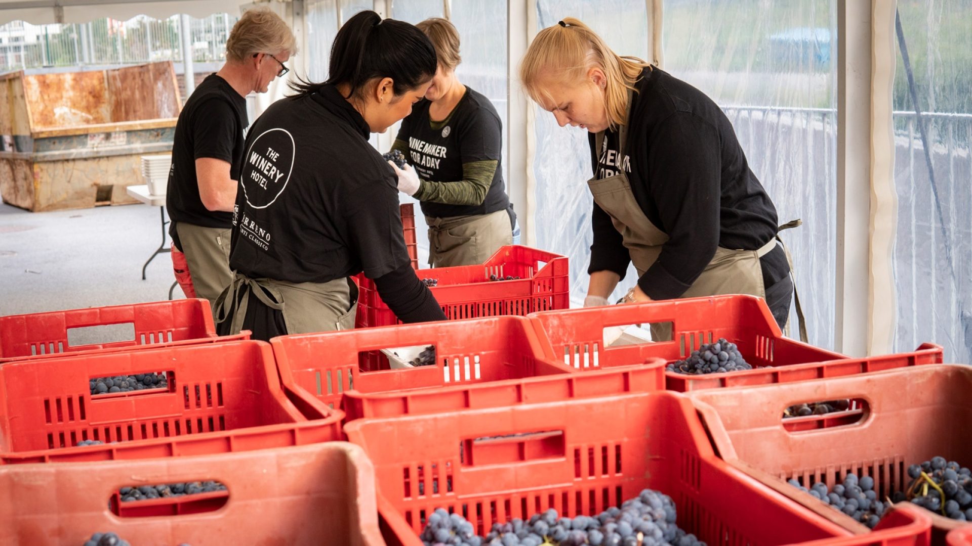 Tidigt i morse kom årets druvor till hotellet! Resan från Toscana ser ut att ha gått bra och de är fina och välbehållna. Nu har vi en intensiv dag framför oss. Som tur är har vi hjälp av både skolelever från restaurang-, hotell och sommelierutbildningar samt vinintresserade hotellgäster.