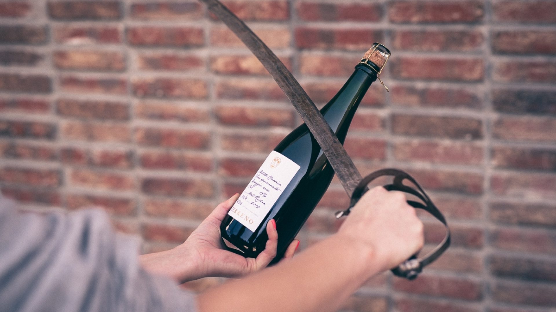 - Håll flaskan stadigt och placera sabreringsföremålet
