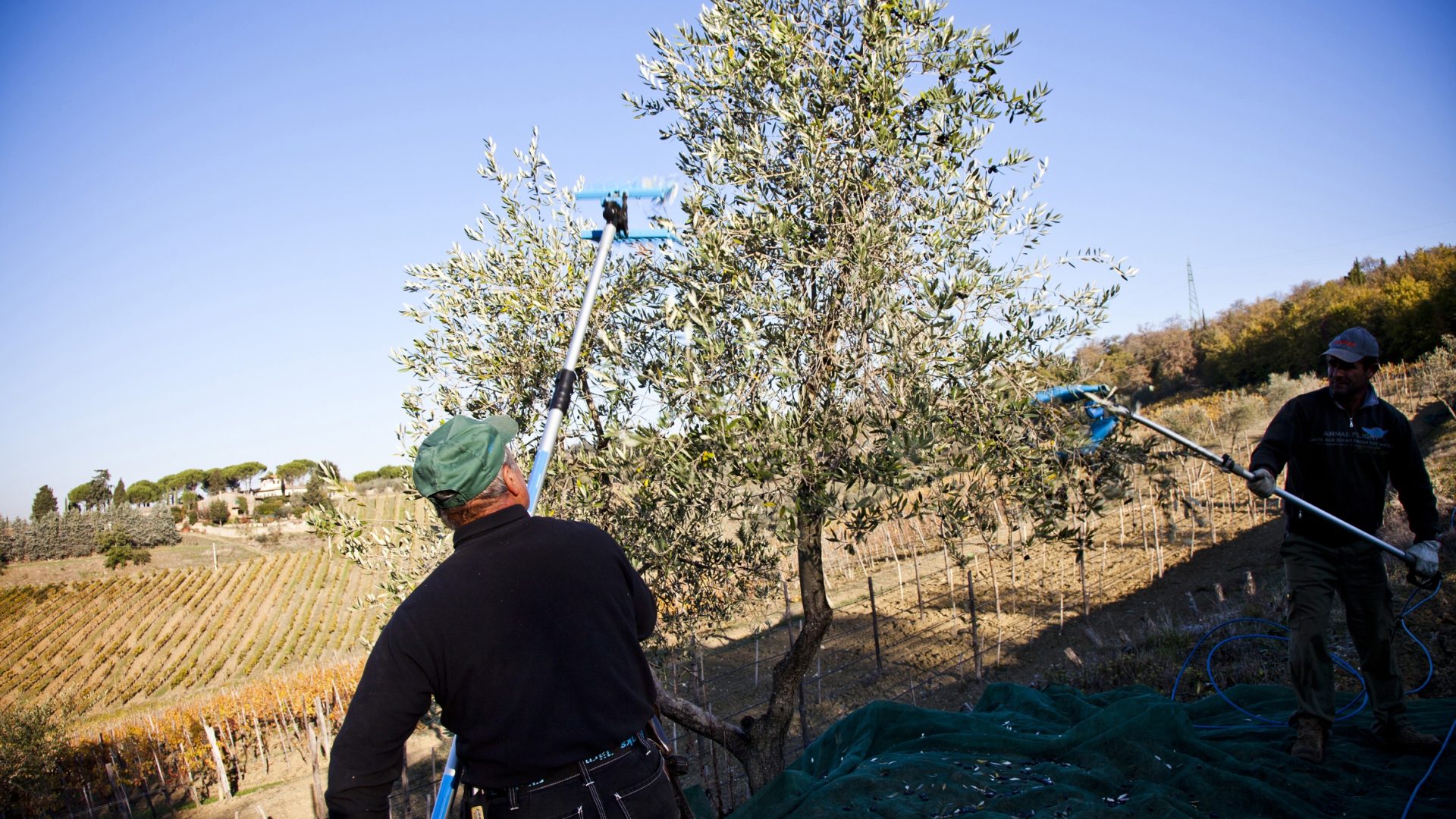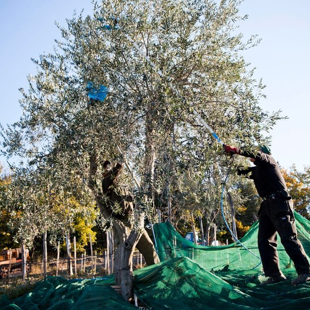 Terreno Extra Vergine Olio di Oliva kommer från våra egna ekologiskt odlade olivträd vilka skördas för hand, fält för fält i november. Oliverna dras försiktigt av kvisten med handkraft och landar mjukt på stora nät som vi placerar under varje träd.