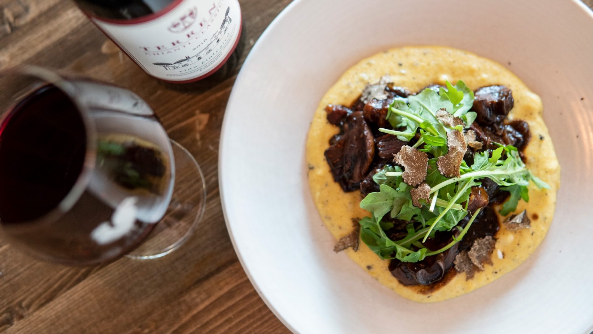 Lägg upp polenta och oxkind, toppa med rucola och skivad färsk tryffel.