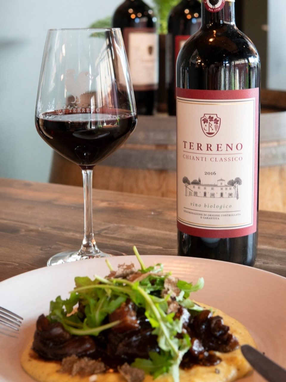 Terreno Chianti Classico är ett rivigt rött kvalitetsvin från Toscana med en typisk karaktär av Sangiovese. Med läskande bärighet och balanserad kryddighet är det här vinet en perfekt match till den här värmande och smakrika rätten.