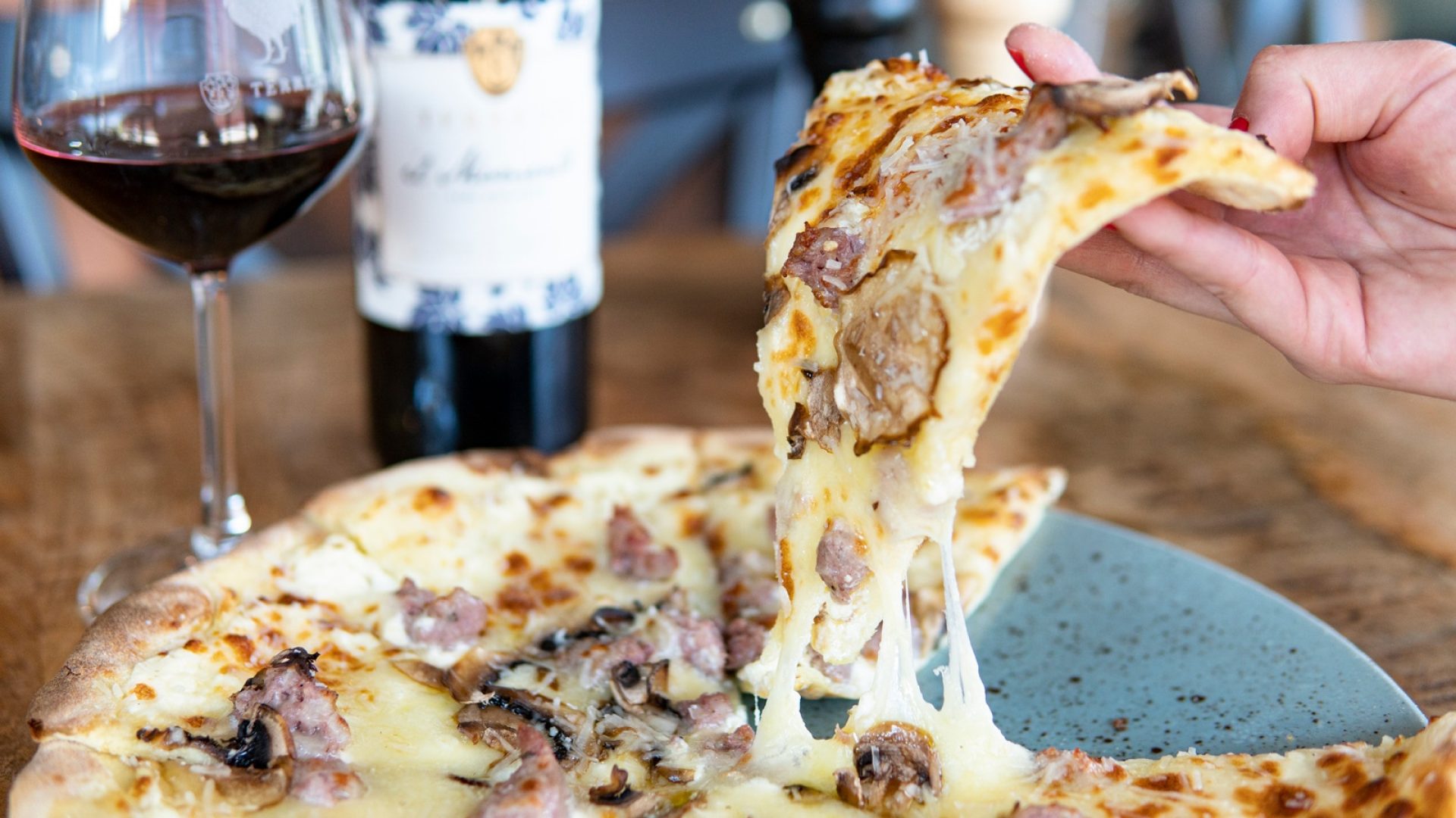 Pizza utan tomatsås kallas ”pizza bianca” i Italien, vit pizza. Du kan toppa den med det du gillar bäst. Vi gillar salsiccia, champinjoner och mozzarella. Kom och njut av den hos oss, ta med den hem eller ge dig på att tillaga den själv hemma.