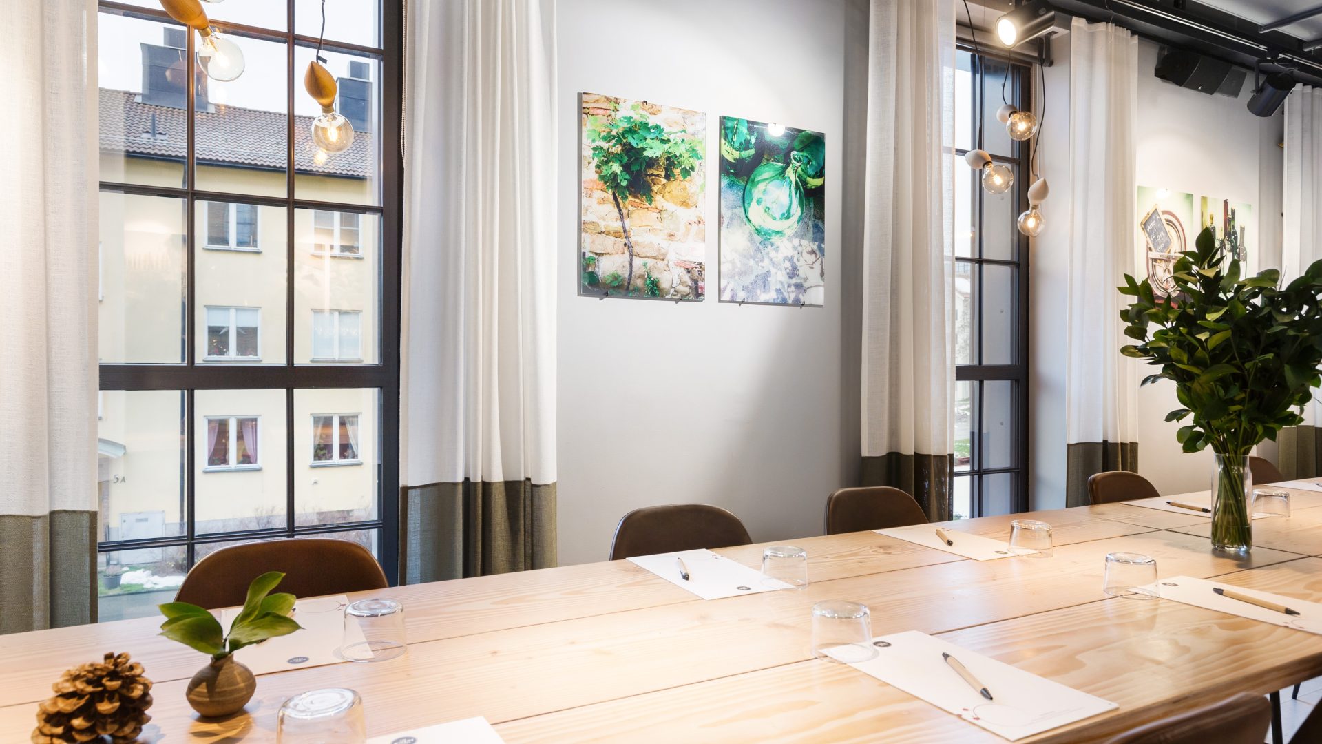 In this room you sit upstairs with glass doors facing the restaurant. One long wall has several windows and the room flows in light. On the walls are wine-inspired art and the feeling is stylish and warm. Ideal for smaller groups of 15-18 people.