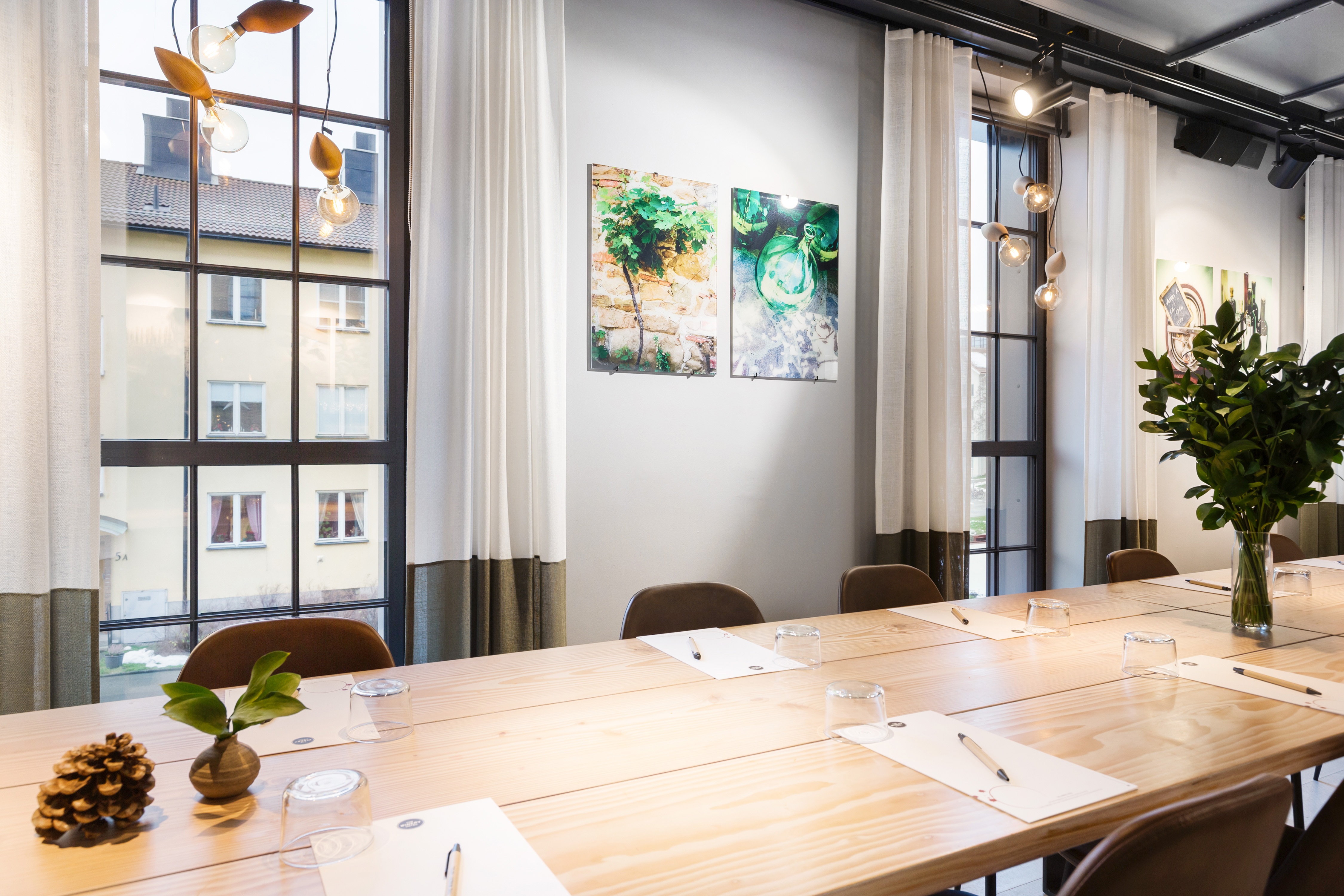 In this room you sit upstairs with glass doors facing the restaurant. One long wall has several windows and the room flows in light. On the walls are wine-inspired art and the feeling is stylish and warm. Ideal for smaller groups of 15-18 people.