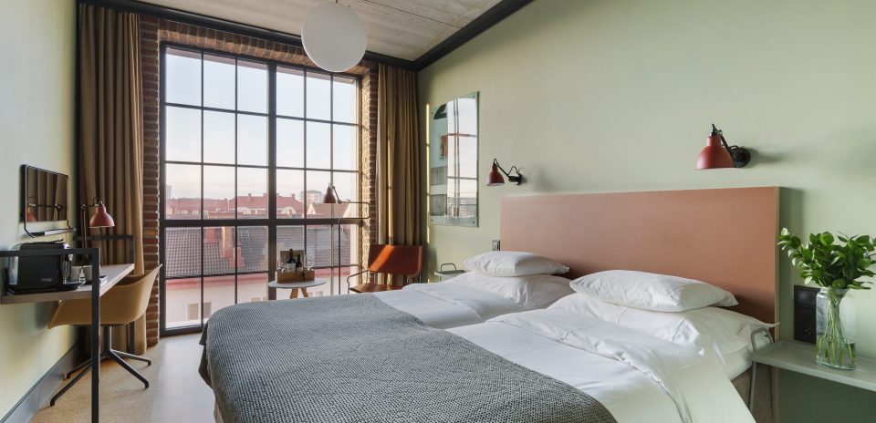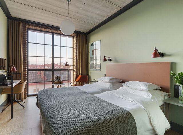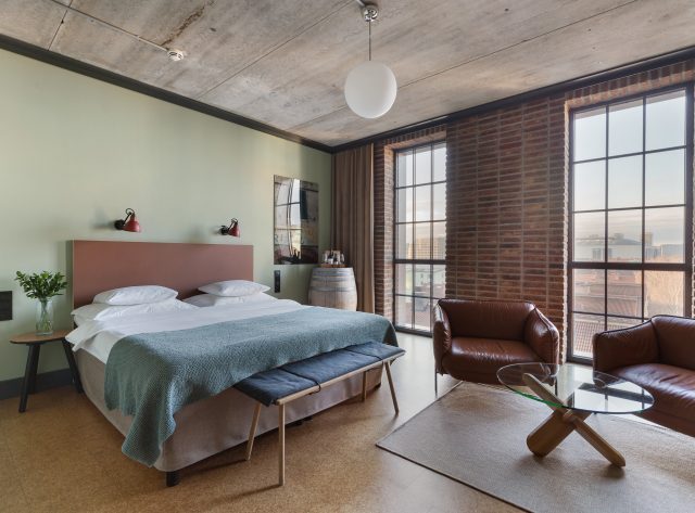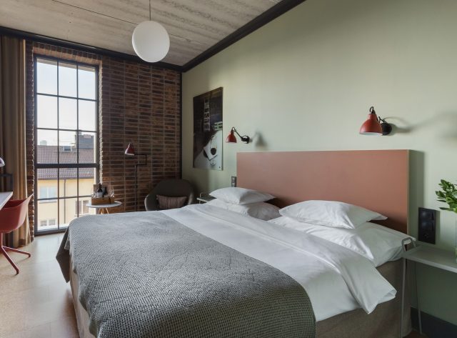 Our rooms are inspired by restored factory buildings in Brooklyn, the brick walls, concrete ceilings and large windows result in an industrial atmosphere. In contrast, the grape-green walls and golden-brown cork floors of the hotel rooms create a warm ambience. All of the rooms have floor-to-ceiling windows with a view of either the lake of Brunnsviken or Arenastaden.