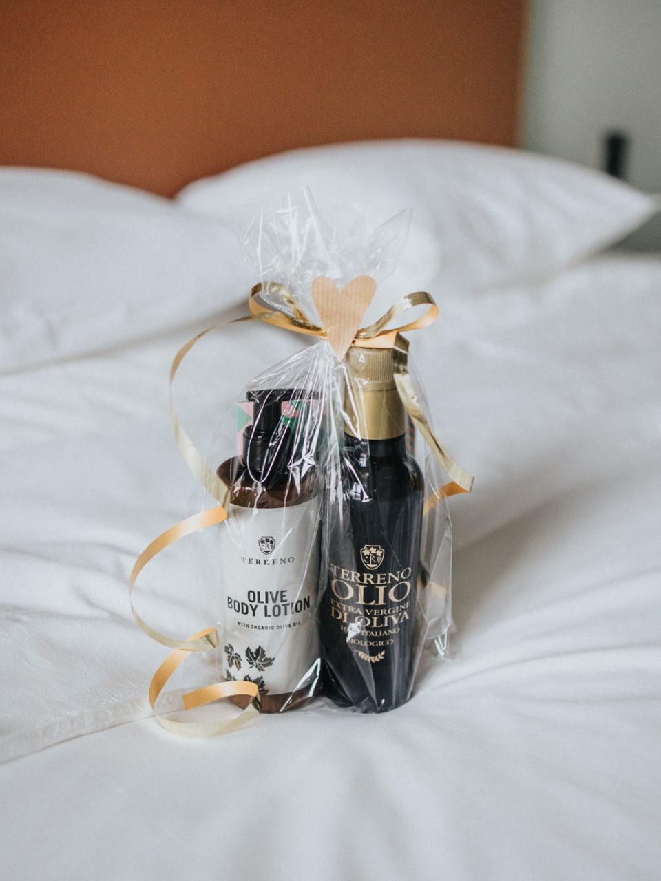 A bottle of organic, extra virgin olive oil from our wine estate Terreno in Tuscany, extra fine chocolate from Malmö chocolate factory, The Winery Hotel's own body lotion with moisturizing olive oil. All packed into a nice gift bag.