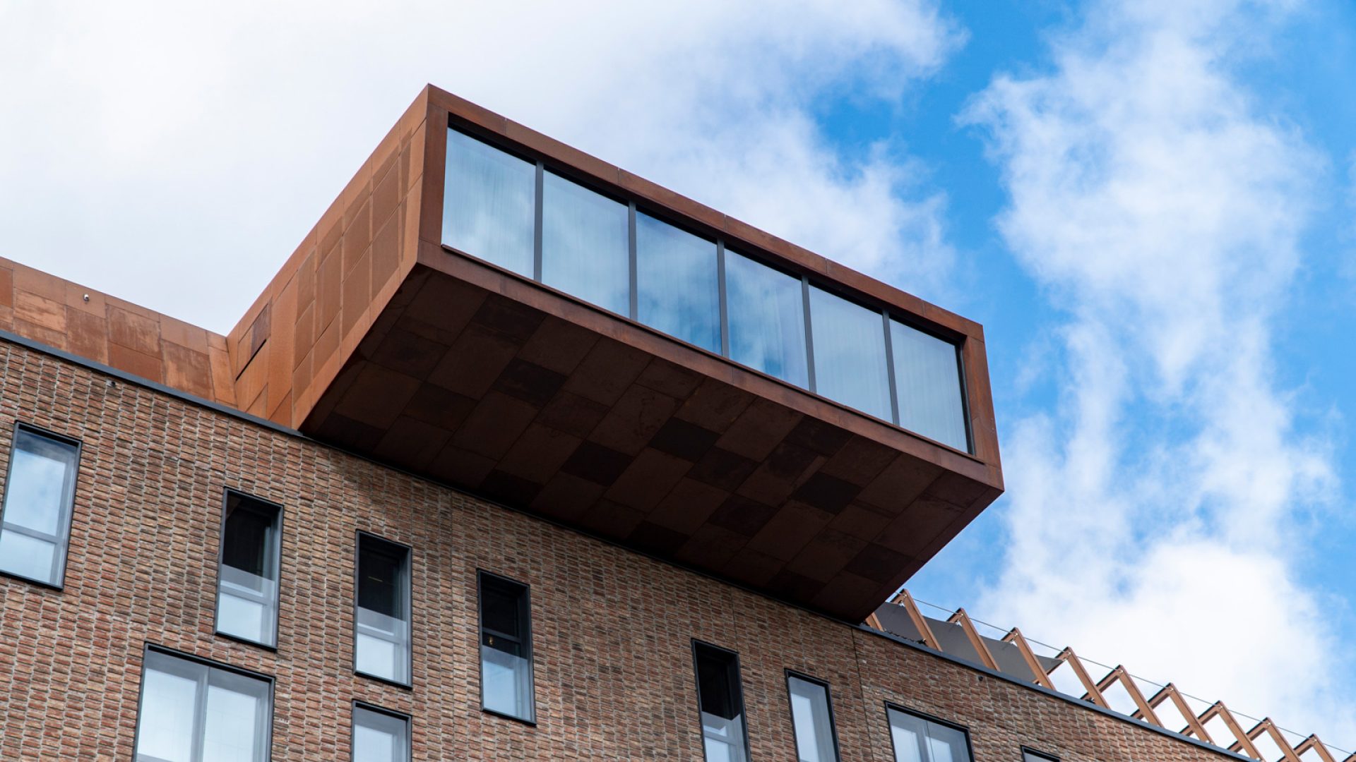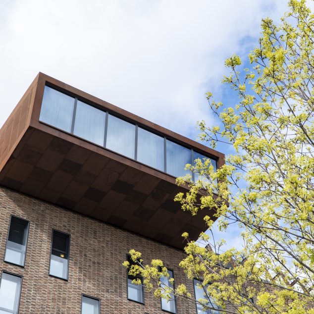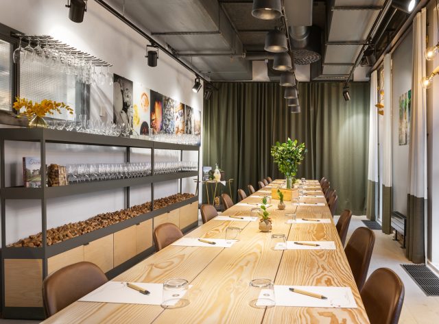 Här möts ni hängandes över kanten i ett rum medvetet konstruerat av och inrett med genomgående hållbara material. Utsidan kläds av långsamrostande cortenstål matchat med ett grönskande sedumtak. Inredningen inspireras av en modern vinkällare med material som ek och järn och med bland annat avsågade vinfat på väggarna som dekor.