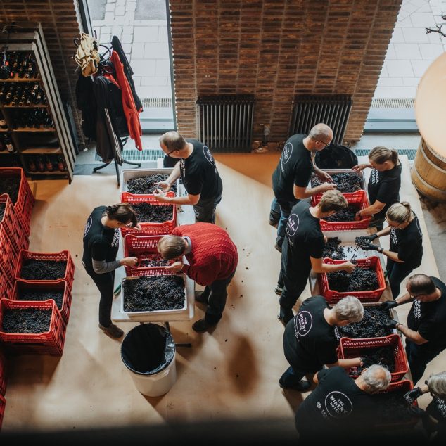 Druvorna sorteras varsamt, avstjälkas, pressas och pumpas in i vineriets tankar. Det sker under ledning av familjen Ruhne som gjort vin på vingården Terreno i Toscana i över 30 år. Den samlade kunskapen om vin och vinmakeri ligger till grund för vinet som tillverkas på The Winery Hotel.